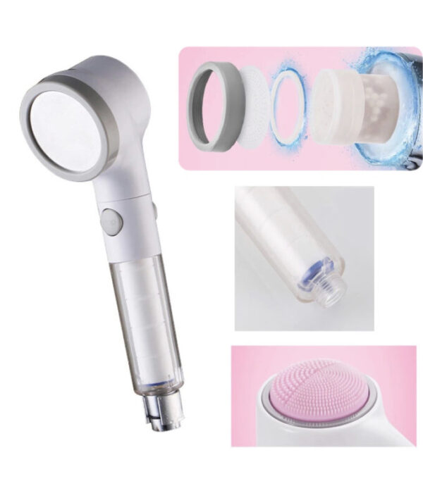 2.Pachetul cuprinde un cap de dus cu microfiltru de bumbac, granule minerale si perie siliconica de curatat: